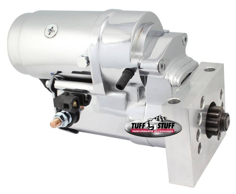 Tuff Stuff starters are hand made from premium quality new components - not remanufactured - and are quality built in USA. Most Gear Reduction style starters, which are considerably smaller than the OE starters, incorporate a mounting block that can be indexed to gain additional clearance. Starters include mounting bolts and shims where applicable. Ideal for high horsepower muscle cars, hot rods, trucks and daily-drivers. Finishes include chrome plated, zinc plated and powder coated.