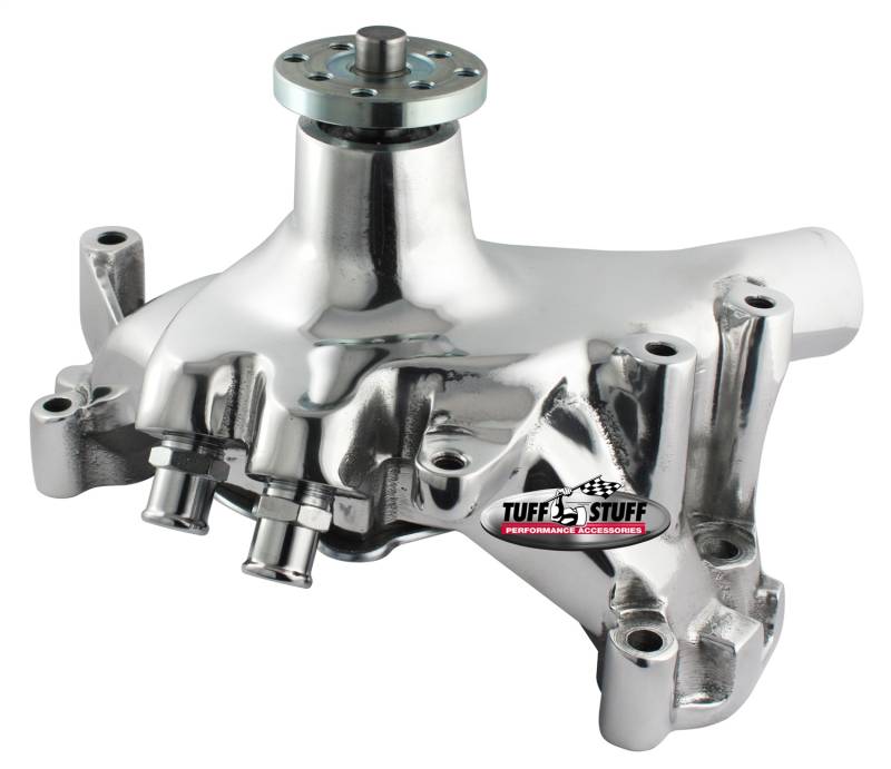 Tuff Stuff water pumps are hand made from premium quality new components - not remanufactured and are quality built in the USA. Precision-made ball/roller bearings and spin-balanced fan hub sustain higher RPMs. Our SuperCool option includes a custom water impeller that flows 30% more coolant to reduce water temperature by up to 20 degrees. Available in chrome plated, polished aluminum, powder coated or as cast finishes.