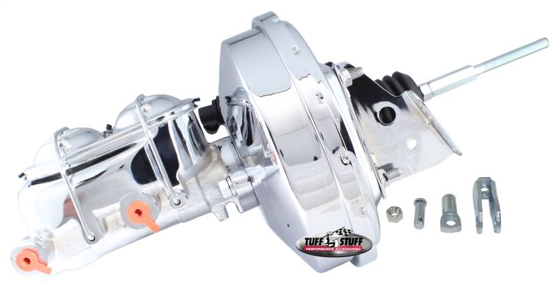 Specific fit applications available in beautiful chrome plated, zinc or black powder coated finishes. 1 in. and 1-1/8 in. master cylinder bores work with disc/disc, disc/drum, and drum/drum brake set-ups. Single and dual diaphragm styles available in 7 in., 8 in., 9 in. and 11 in. diameters to fit virtually all hot rods, customs and muscle cars. 100% all new components - and every unit is vacuum tested to insure reliability. Works with many stock mounting brackets and Tuff Stuff universal brackets.