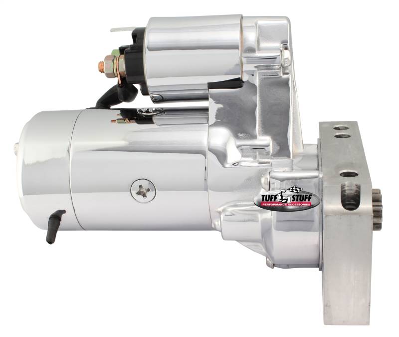 Tuff Stuff starters are hand made from premium quality new components - not remanufactured - and are quality built in USA. Most Gear Reduction style starters, which are considerably smaller than the OE starters, incorporate a mounting block that can be indexed to gain additional clearance. Starters include mounting bolts and shims where applicable. Ideal for high horsepower muscle cars, hot rods, trucks and daily-drivers. Finishes include chrome plated, zinc plated and powder coated.