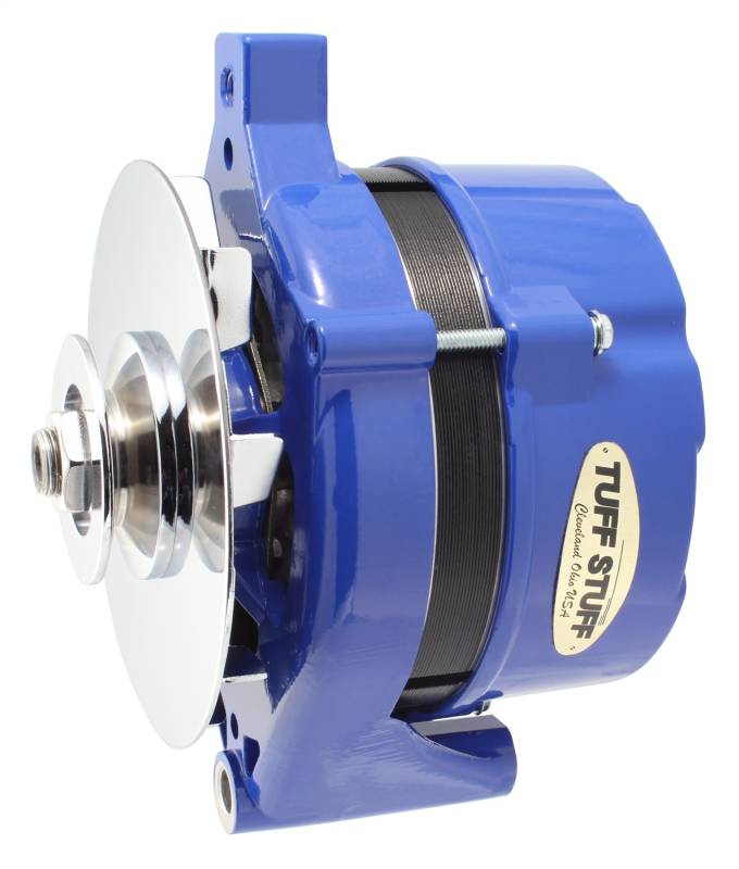 All Tuff Stuff alternators are hand built in Cleveland, Ohio and are tested to meet or exceed OEM specifications. All Tuff Stuff alternators are made from 100% new components and carry a one year limited warranty. Tuff Stuff has alternator applications for virtually all muscle cars, hot rods, customs and light trucks in just about every finish imaginable. Available in chrome plated, polished aluminum, powder coated and plain as cast finishes. All alternators are for 12 volt, negative ground systems, except where noted.