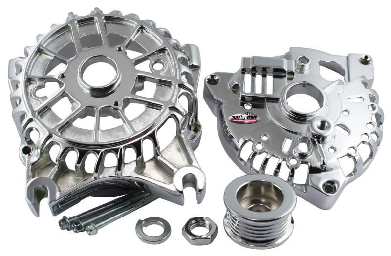 Alternator Case Kit Fits Ford 3GEN And Tuff Stuff Alternator PN[8252] Incl. Front And Rear Housings/Fan/Pulley/Nut/Lockwashers/Thru Bolts Chrome Plated 7500N