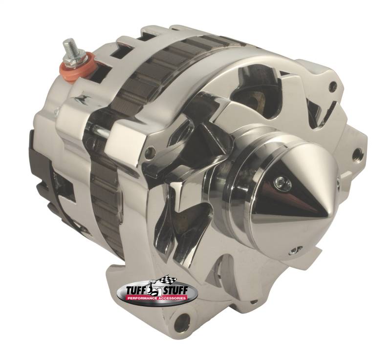 All Tuff Stuff alternators are hand built in Cleveland, Ohio and are tested to meet or exceed OEM specifications. All Tuff Stuff alternators are made from 100% new components and carry a one year limited warranty. Tuff Stuff has alternator applications for virtually all muscle cars, hot rods, customs and light trucks in just about every finish imaginable. Available in chrome plated, polished aluminum, powder coated and plain as cast finishes. All alternators are for 12 volt, negative ground systems, except where noted.
