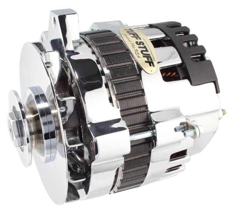 All Tuff Stuff alternators are hand built in Cleveland, Ohio and are tested to meet or exceed OEM specifications. All Tuff Stuff alternators are made from 100% new components and carry a one year limited warranty. Tuff Stuff has alternator applications for virtually all muscle cars, hot rods, customs and light trucks in just about every finish imaginable. Available in chrome plated, polished aluminum, powder coated and plain as cast finishes. All alternators are for 12 volt, negative ground systems, except where noted.