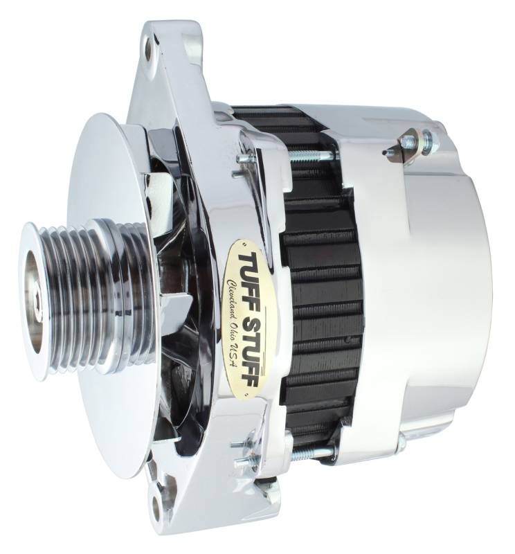 All Tuff Stuff alternators are hand built in Cleveland, Ohio and are tested to meet or exceed OEM specifications. All Tuff Stuff alternators are made from 100% new components and carry a one year limited warranty. Tuff Stuff has alternator applications for virtually all muscle cars, hot rods, customs and light trucks in just about every finish imaginable. Available in chrome plated, polished aluminum, powder coated and plain as cast finishes. All alternators are for 12 volt, negative ground systems, except where noted.