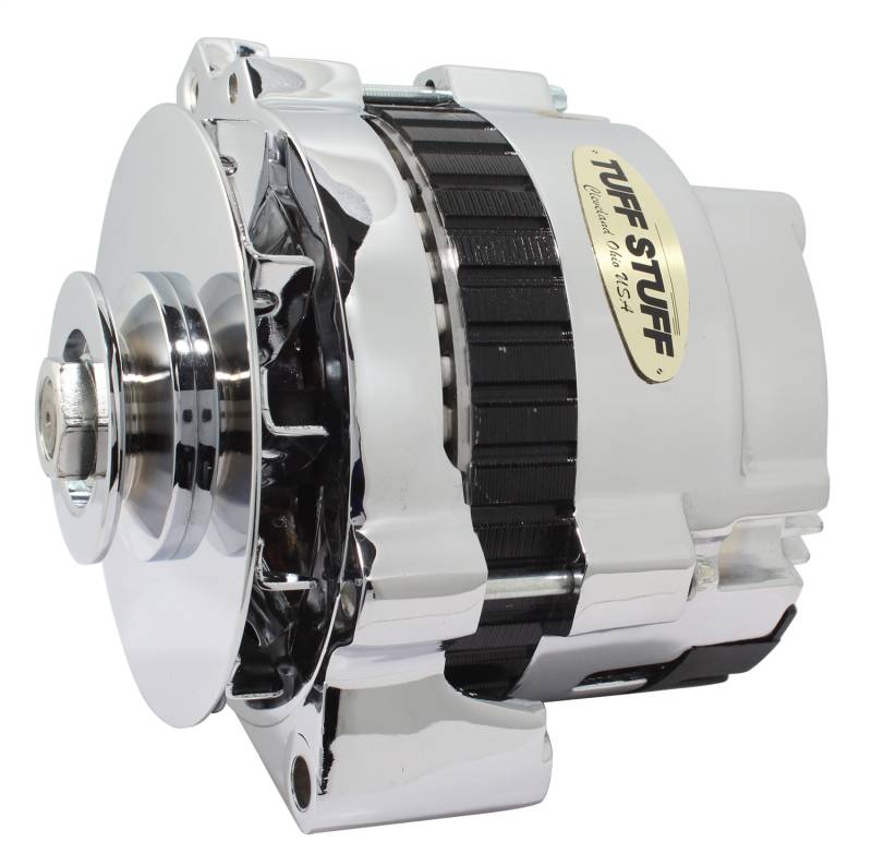 All Tuff Stuff alternators are hand built in Cleveland, Ohio and are tested to meet or exceed OEM specifications. All Tuff Stuff alternators are made from 100% new components and carry a one year limited warranty. Tuff Stuff has alternator applications for virtually all muscle cars, hot rods, customs and light trucks in just about every finish imaginable. Available in chrome plated, polished aluminum, powder coated and plain as cast finishes. All alternators are for 12 volt, negative ground systems, except where noted.