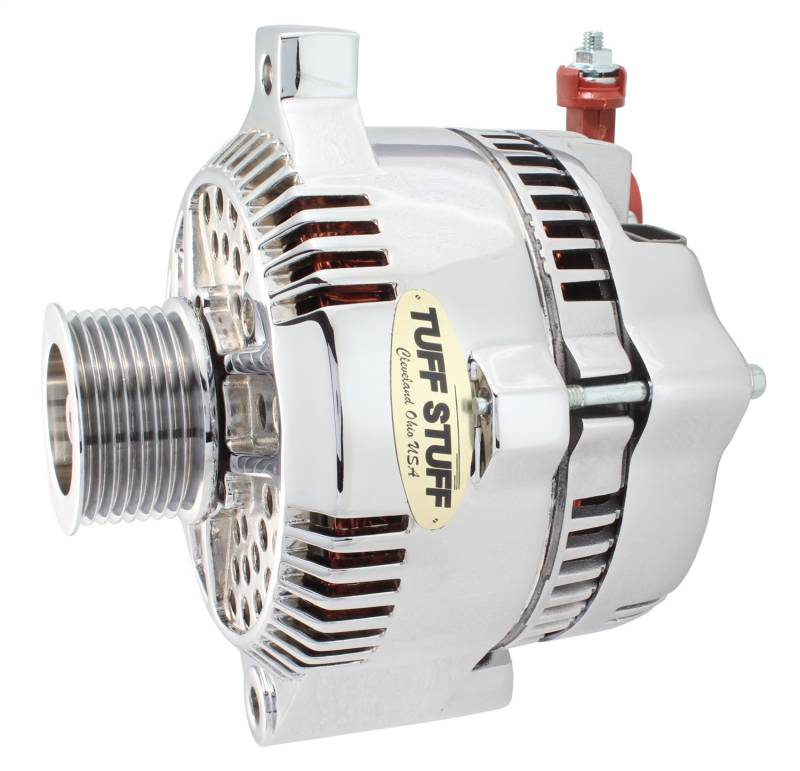 All Tuff Stuff alternators are hand built in Cleveland, Ohio and are tested to meet or exceed OEM specifications. All Tuff Stuff alternators are made from 100% new components and carry a one year limited warranty. Tuff Stuff has alternator applications for virtually all muscle cars, hot rods, customs and light trucks in just about every finish imaginable. Available in chrome plated, polished aluminum, powder coated and plain as cast finishes. All alternators are for 12 volt, negative ground systems, except where noted.