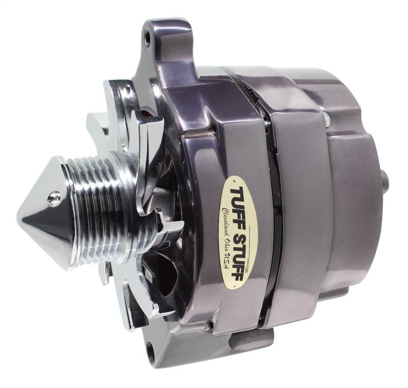 All Tuff Stuff alternators are hand built in Cleveland, Ohio and are tested to meet or exceed OEM specifications. All Tuff Stuff alternators are made from 100% new components and carry a one year limited warranty. Tuff Stuff has alternator applications for virtually all muscle cars, hot rods, customs and light trucks in just about every finish imaginable. Available in chrome plated, polished aluminum, powder coated and plain as cast finishes. All alternators are for 12 volt, negative ground systems, except where noted.