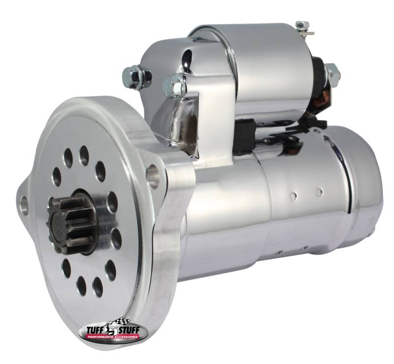 Tuff Stuff starters are hand made from premium quality new components - not remanufactured - and are quality built in USA. Most Gear Reduction style starters, which are considerably smaller than the OE starters, incorporate a mounting block that can be indexed to gain additional clearance. Starters include mounting bolts and shims where applicable. Ideal for high horsepower muscle cars, hot rods, trucks and daily-drivers. Finishes include chrome plated, zinc plated and powder coated.