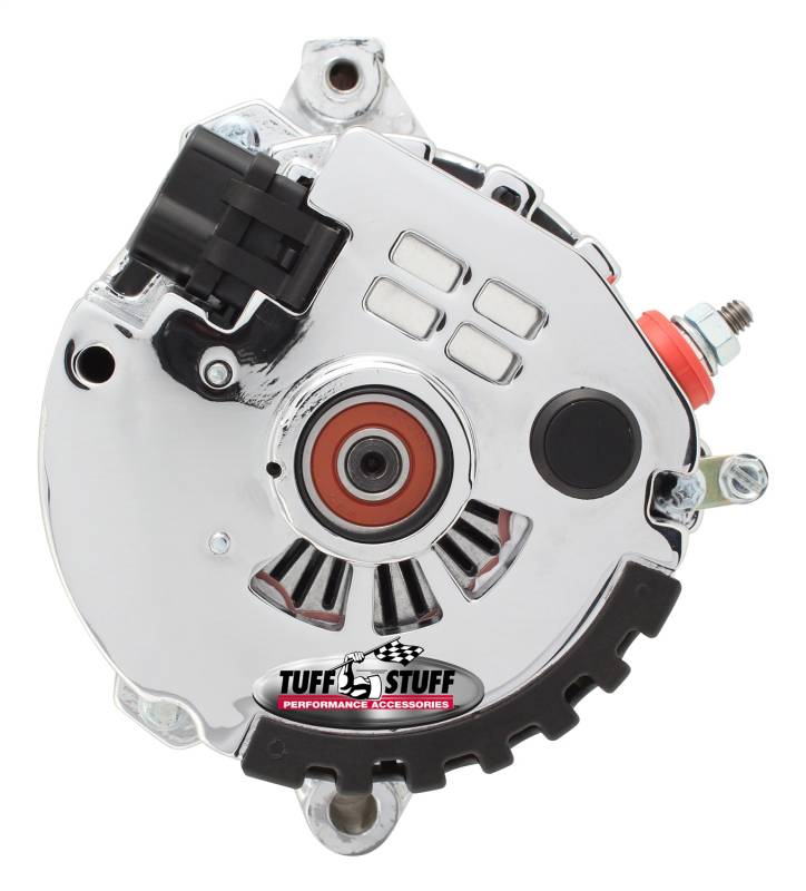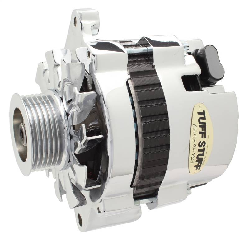 All Tuff Stuff alternators are hand built in Cleveland, Ohio and are tested to meet or exceed OEM specifications. All Tuff Stuff alternators are made from 100% new components and carry a one year limited warranty. Tuff Stuff has alternator applications for virtually all muscle cars, hot rods, customs and light trucks in just about every finish imaginable. Many enthusiasts prefer our clean, simple 1-wire alternator option which features a low idle cut-in internal regulator and provides plenty of charging at low RPMs. Available in chrome plated, polished aluminum, powder coated and Factory Cast PLUS+ finishes. All alternators are for 12 volt, negative ground systems, except where noted.